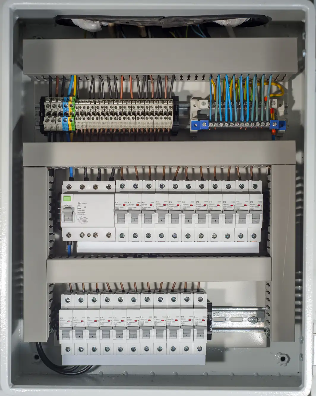 An electrical distribution panel with circuit breakers, wiring, and terminal blocks, neatly organized inside a gray metal enclosure. The panel includes labels and various colored wires connected to the components.